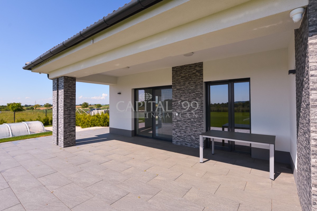 Előtér 5,53 nm, mosókonyha + WC 3,38 nm, kamra 3,19 nm, konyha + étkező 23,13 nm, nappali 17,86 nm, szoba 14,90 nm, előtér + gardrób 7,23 nm, fürdőszoba + WC 9,15 nm, közlekedő 4,16 nm, szoba 9,56 nm, szoba 10,26 nm, szoba 11,19 nm. Terasz 23,34 nm.
