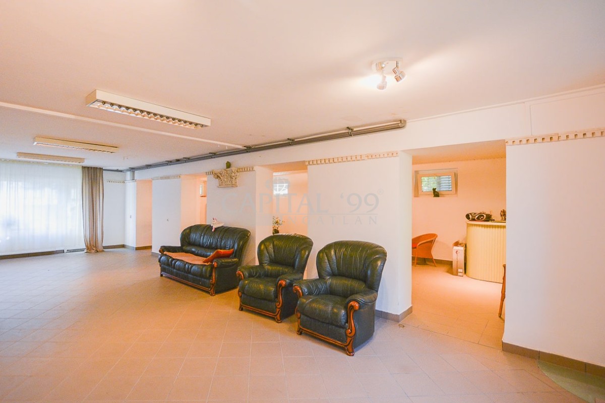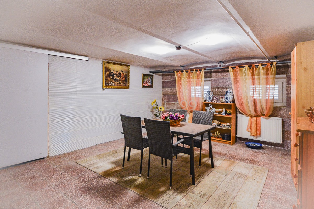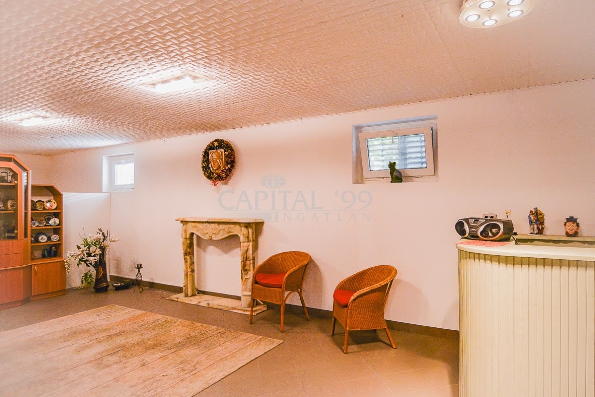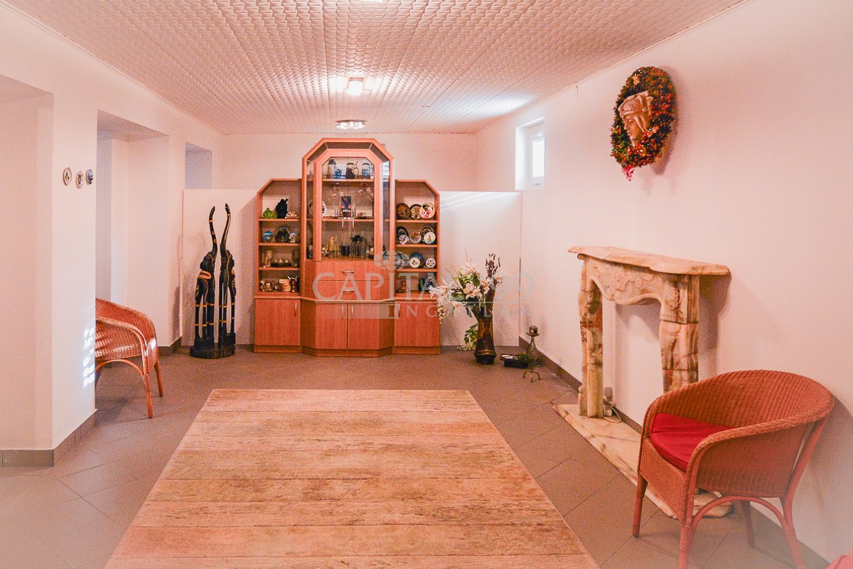 Földszint 220,0 m2: nappali, előtér, fürdőszoba, spájz, szoba, szoba, szoba, konyha+étkező, fürdőszoba+wc. Terasz 60,0 m2. Szuterén 230,0 m2: szauna-helyiség, műhely, hobby-helyiség, hobby-helyiség, hobby-helyiség, wc. Gépkocsibeálló 50,0 m2.