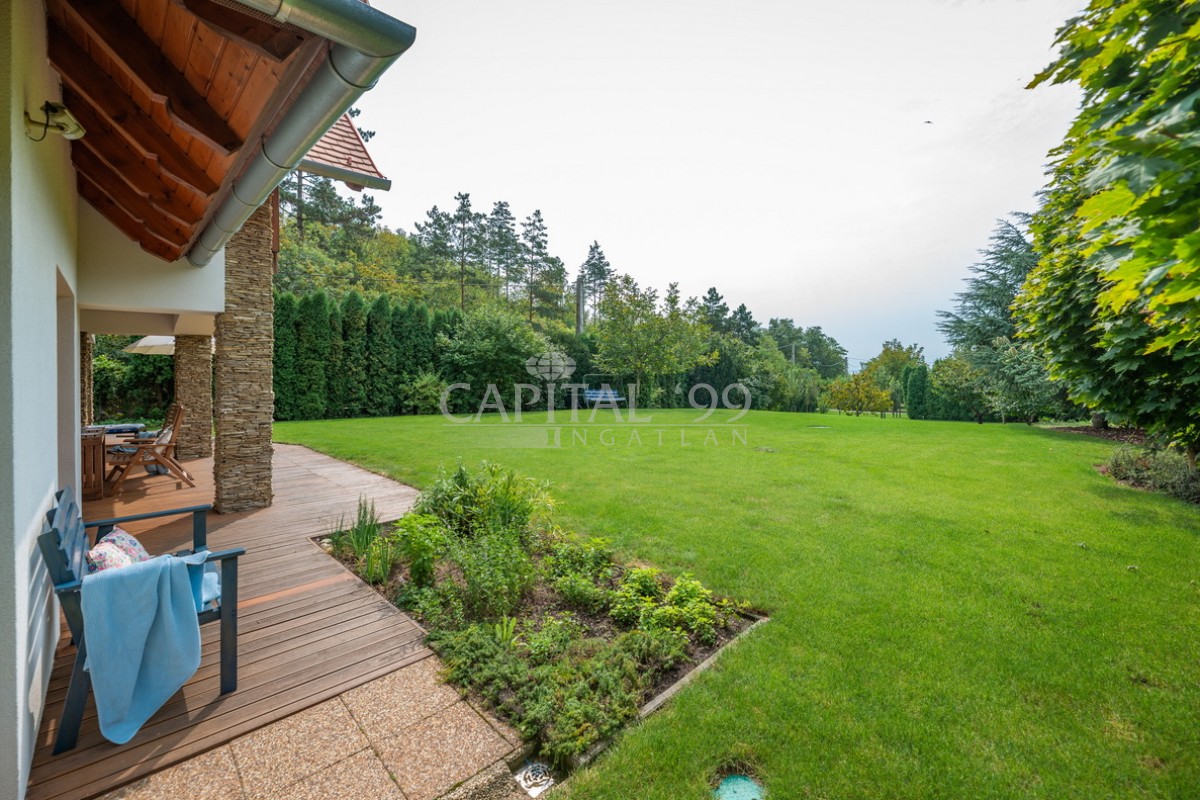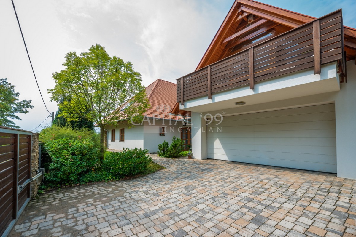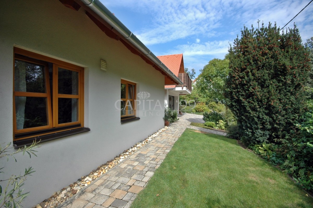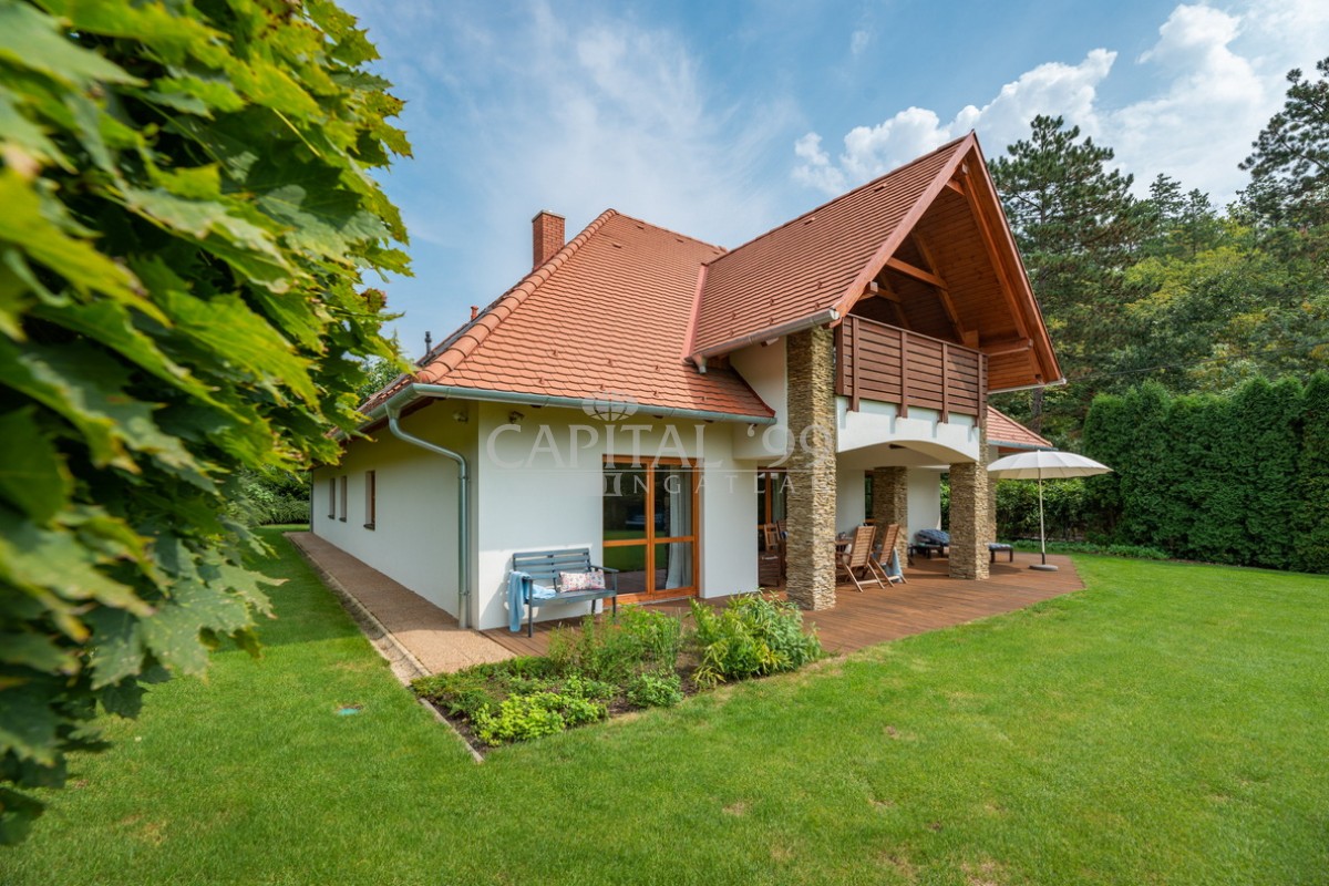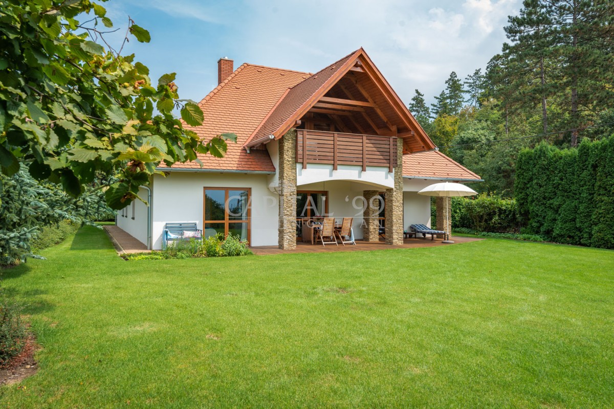 kódszám: 4355Nagyon igényesen megépített családi ház közvetlenül erdő mellett, a Balaton északi partján, Hévíz, Keszthely közelében. A házhoz dupla telek tartozik, ami nagyon szépen parkosított. A telken örökzöldek, gyümölcsfák megtalálhatóak. A tetőtéri teraszról szép panoráma nyílik a Balatonra. Érdemes megnézni, mivel különleges fekvésű, és minden igényt kielégítő családi házról van szó! A ház dupla telken található, 2 helyrajzi számon. A telken igény szerint további ház építhető. A családi ház egy átmenő forgalomtól mentes zsákutcában található! Ez valóban nem mindennapi ajánlat!